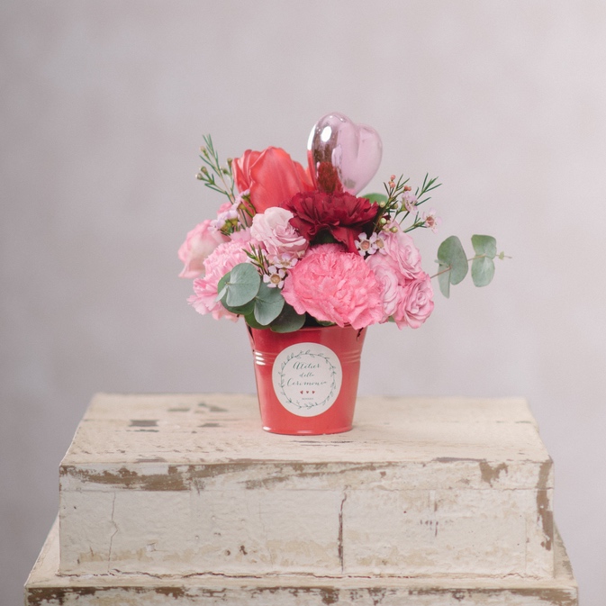 Bon bon è una stupenda latta di colore rossa con fiori misti Rossi e rosa