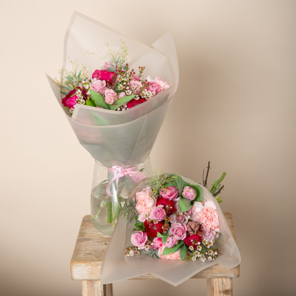 Un bouquet che porta il calore e l’allegria della Primavera grazie ai toni del rosa e del rosso che lo compongono.